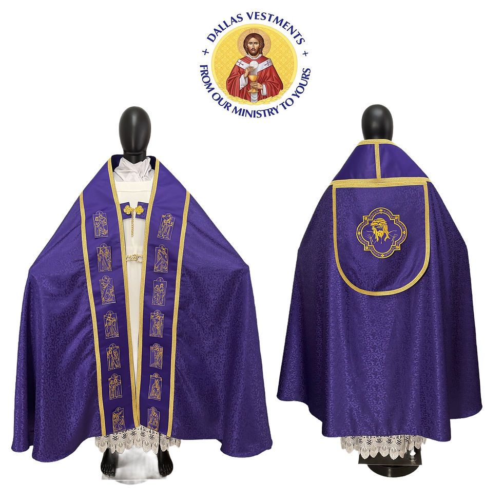 We offer service for the celebration sets, including matching celebrant chasubles, concelebrant chasubles, dalmatics, and stoles. Don't hesitate to get in touch with us via dallasvestment@gmail.com to check for designs and availability.