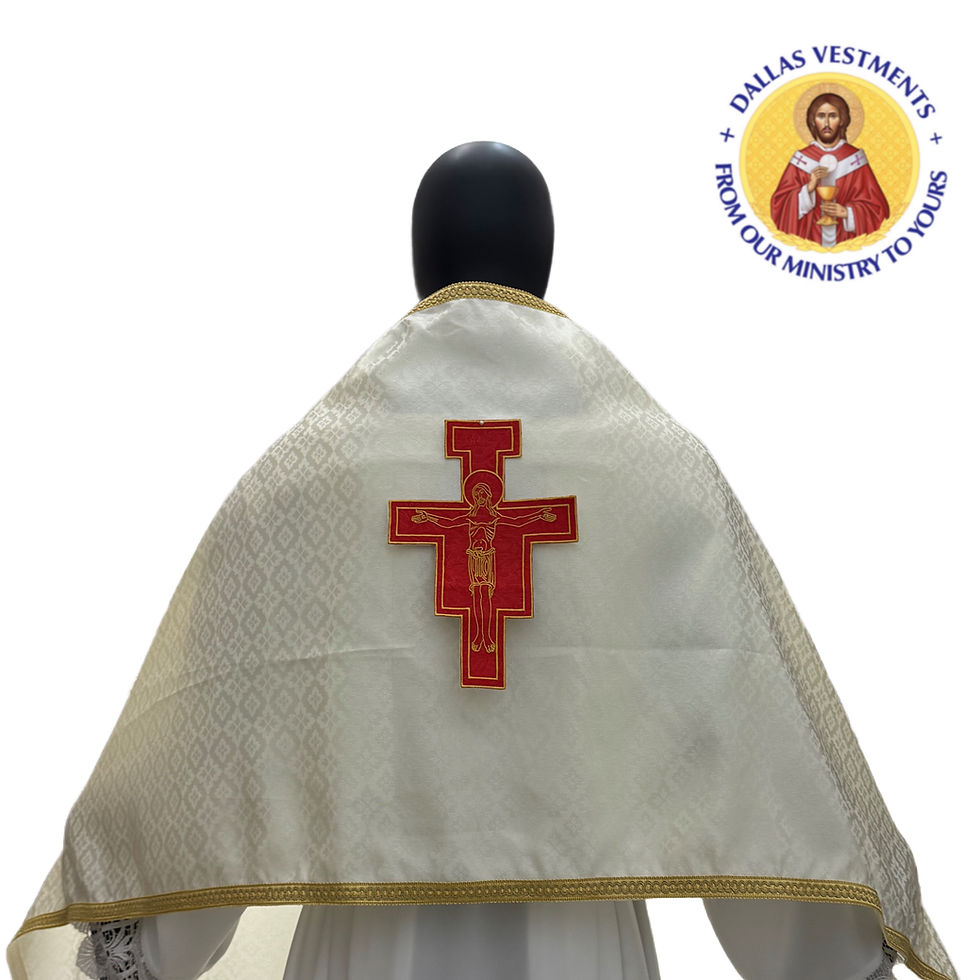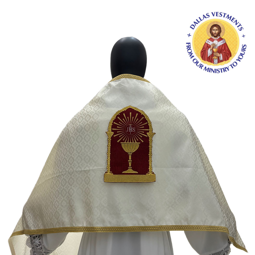A humeral veil is a long, rectangular vestment worn over the shoulders by a priest or deacon during certain Christian liturgical ceremonies. It is used to cover the hands when handling sacred vessels, such as the monstrance or paten, and it symbolizes that Christ, not the minister, is performing the sacred action and blessing the people.